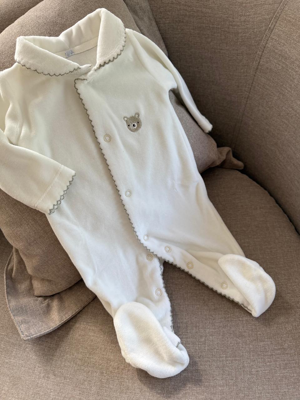 Enterito de plush color blanco con detalle bordado de osito y picot al tono.