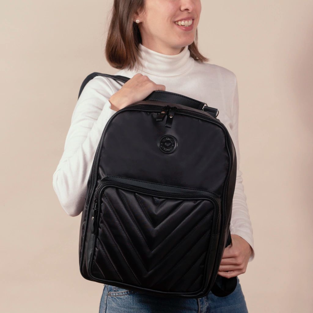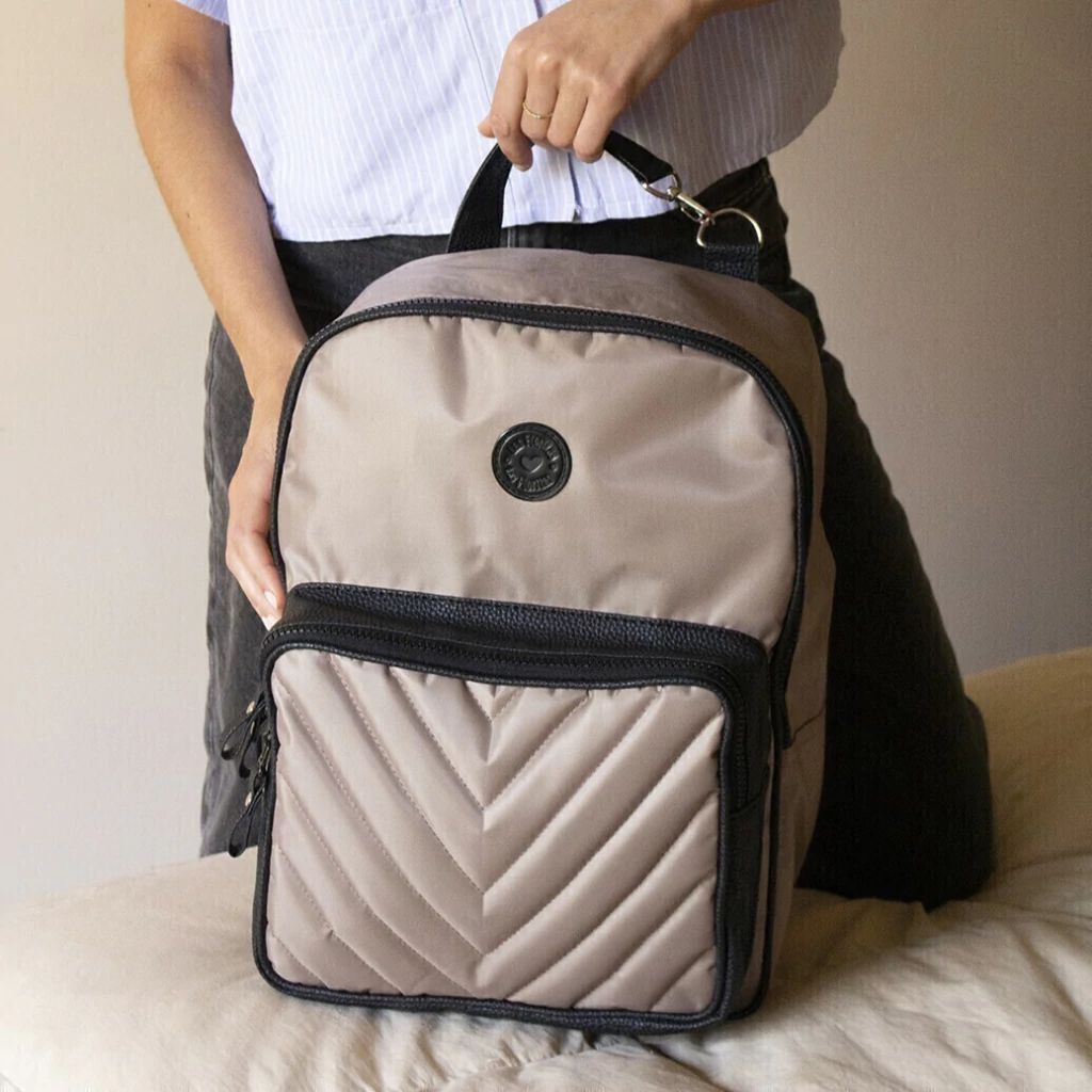 Fabricada en tela rasada Andorra, esta mochila combina estilo y funcionalidad. Incluye un bolsillo frontal térmico para dos mamaderas y un interior impermeable que protege tus pertenencias.