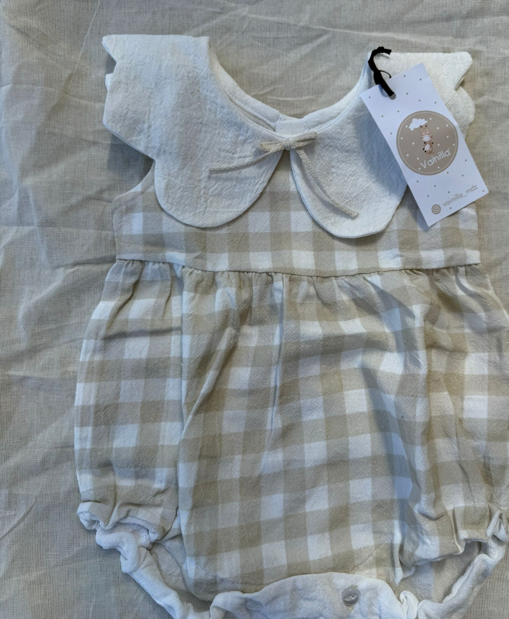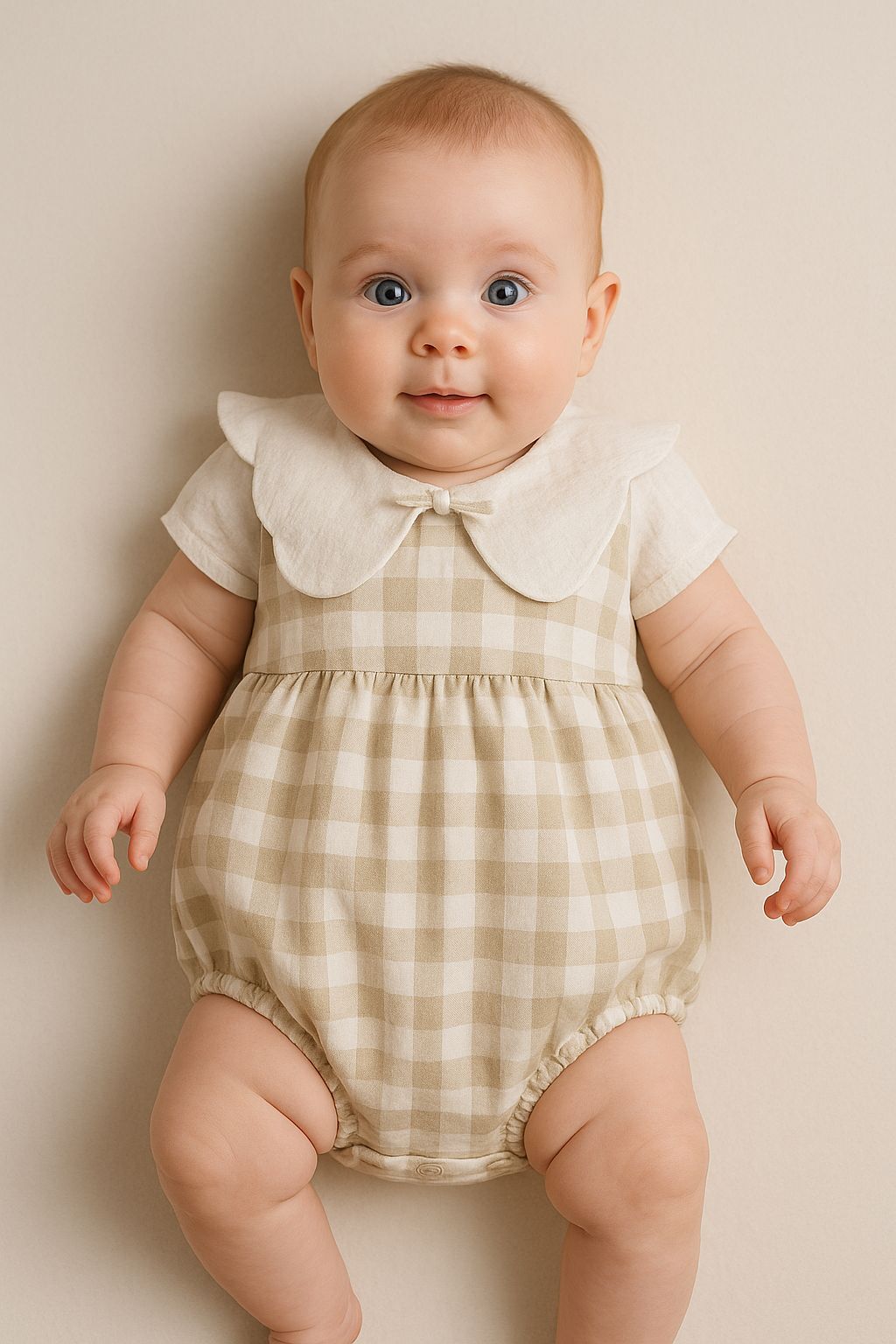 Bombachudo de lino con cuadrille beige y cuello nube.