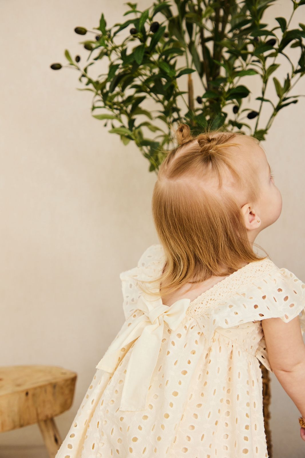 Vestido de brodery color crema con volados y moño en la espalda al tono